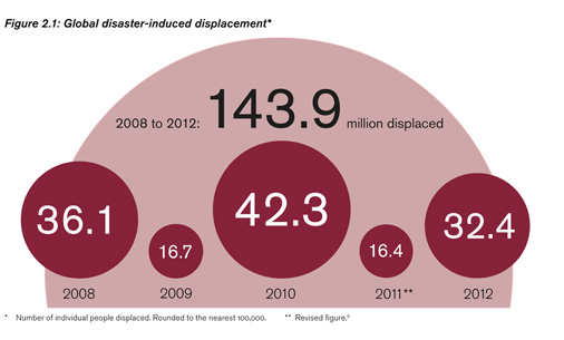 This report states that in 2012, an estimated 32.4 million people in 82 countries were newly displaced by disasters associated with natural hazard events. Over five years from 2008 to 2012, around 144 million people were forced from their homes in 125 countries. The majority of this displacement (98% in 2012 and 83% over five years) occurred due to climate and weather related hazards which include floods, storm, etc.