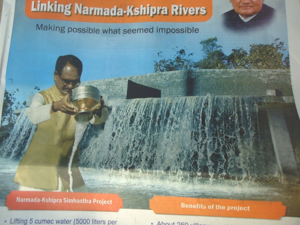 The full page advertisement (going on daily during Feb 23-25, 2014 at huge public expense) and the hype that is being created by the Madhya Pradesh’s BJP government around pumping of around 5000 litres of Narmada water per second from a small Sisalia tank through 47 km long pipeline involving four stage pumping and releasing in the bed of dry KshipraRiver needs to be put in correct perspective. Madhya Pradesh government calls it river linking that too “the first-ever river linking project of the country” (see Madhya Pradesh Govt press release dated: Jan 9, 2013[1]). Such claims are not only a fraudulent presentation, possibly aimed to create a hype in view of the upcoming elections, but are factually wrong in many ways. In MP itself, Indore and Bhopal [both outside Narmada basin] have been getting water from Narmada river through such pipeline schemes for many years, Indore is now getting water through third phase of the scheme). More importantly, the project will not be able to deliver most of the benefits it claims.