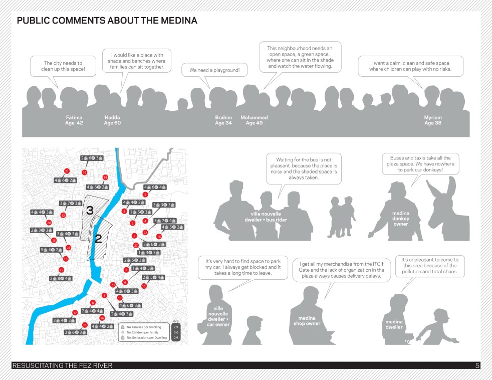 The interventions she proposed were relevant for the specific location and situation and the strategies are more generally applicable: “So we proposed three main interventions: a pedestrian plaza, a playground and a botanical garden. We used four main strategies: precisely placed interventions strategically phased to enhance water quality, remediate contaminated sites, create open spaces, and build on existing resources for economic development. These interventions had to benefit the population on several levels — social, environmental, economic, urban — and be resilient, so that it would still function regardless of changes in budget, political climate, and so on. At the wider city scale, we needed to prevent the newly cleaned river water inside the medina from getting polluted upstream, so we recommended measures for improving regional water quality, too. Depending on soil geomorphology, levels of water pollution, adjacent urban fabric and ecological systems, we purposefully located various rehabilitation tactics like canal restorers, constructed wetlands, bank restoration and storm-water retention ponds.”