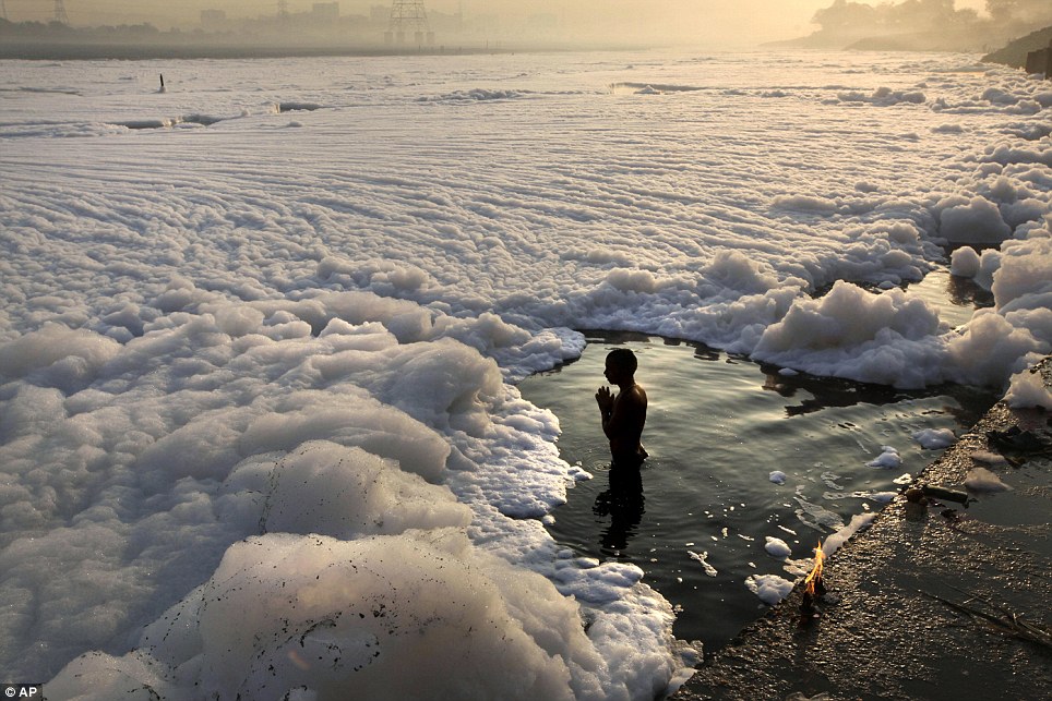 Wroshipping the polluted Yamuna. Photo from Daily Mail. co.uk