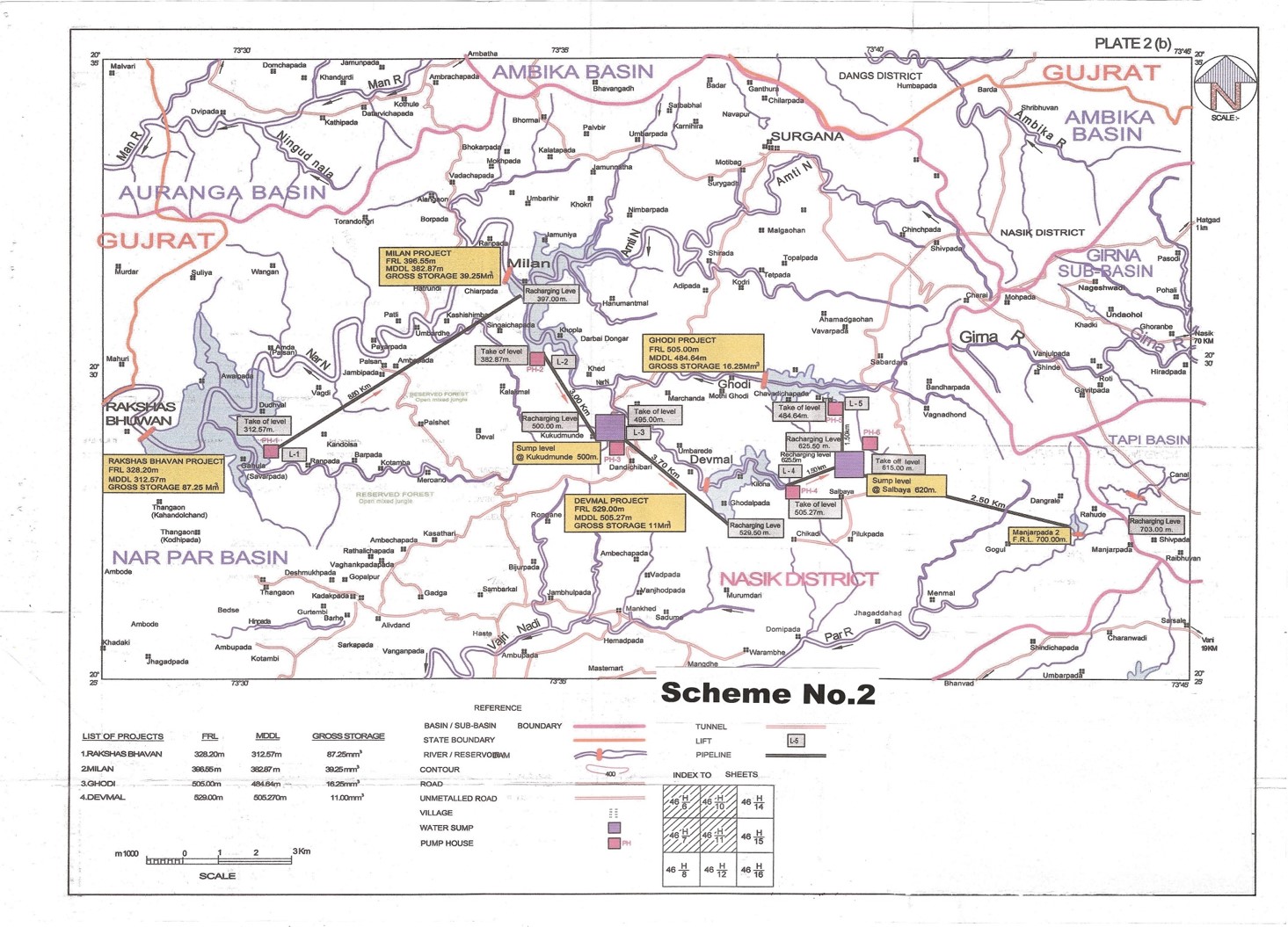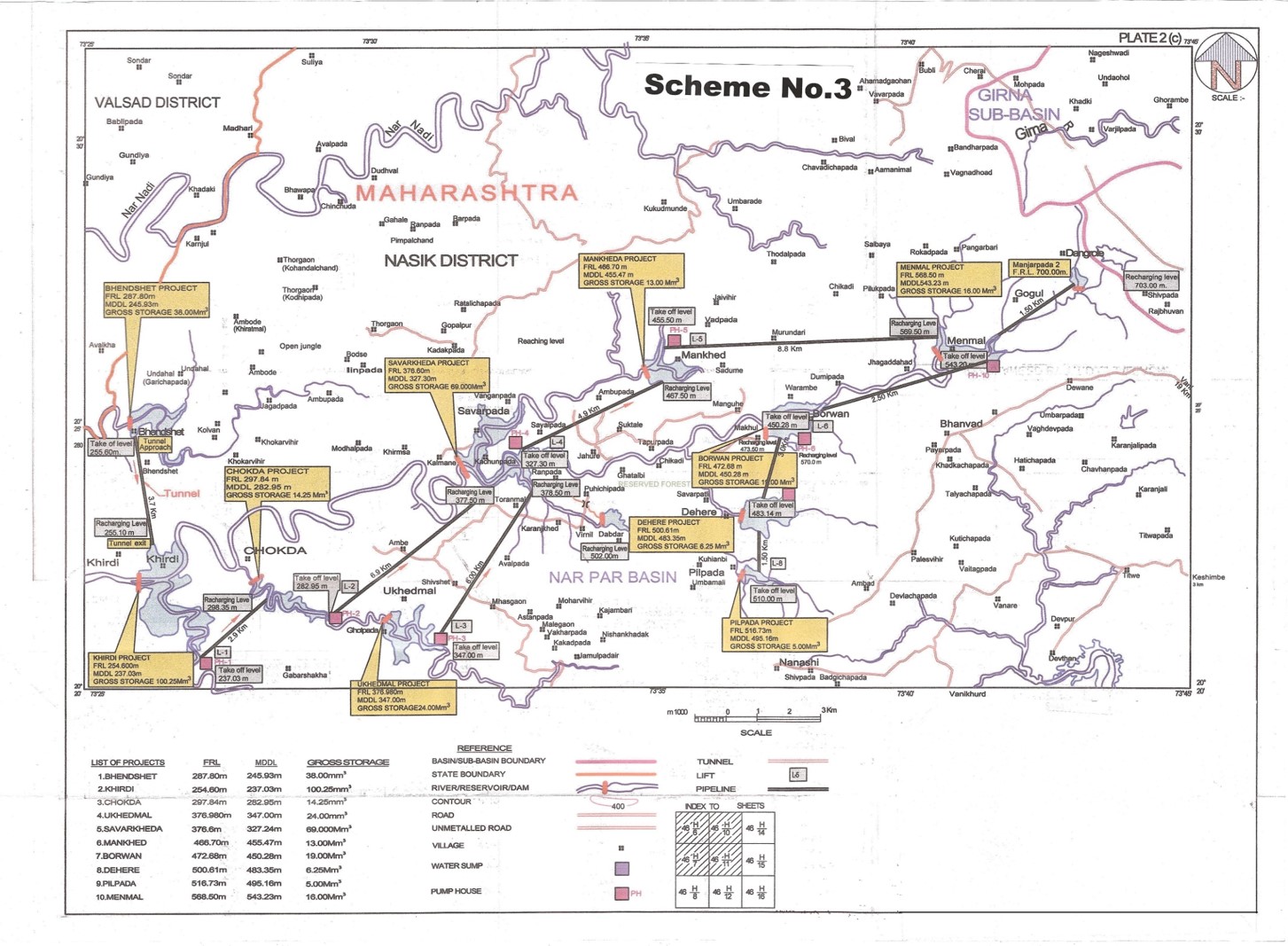 Tapi Irrigation Development Corporation (TIDC) Modified Link Project: So NWDA PFR was modified by TIDC of Government of Maharashtra (GoM) and submitted to GoM in September 2011. According to this Modified PFR, the cost of the project will be close to Rs 6866.09 Crores with a BC Ratio of 1.73 and IRR of 15.11, much higher than the NWDA proposal. This project aims to divert 549 MCM water from Auranga-Ambika-Nar-Par basins through 22 Dams. The project is made up of three schemes of 22 projects inter connected through tunnels, canals, rising mains, barrages, etc. Water stored in these dams is envisaged to be pumped up across the ridge line and transferred into the Girna Sub basin through proposed Manjarpada 2 diversion scheme in Dindori, Nashik.