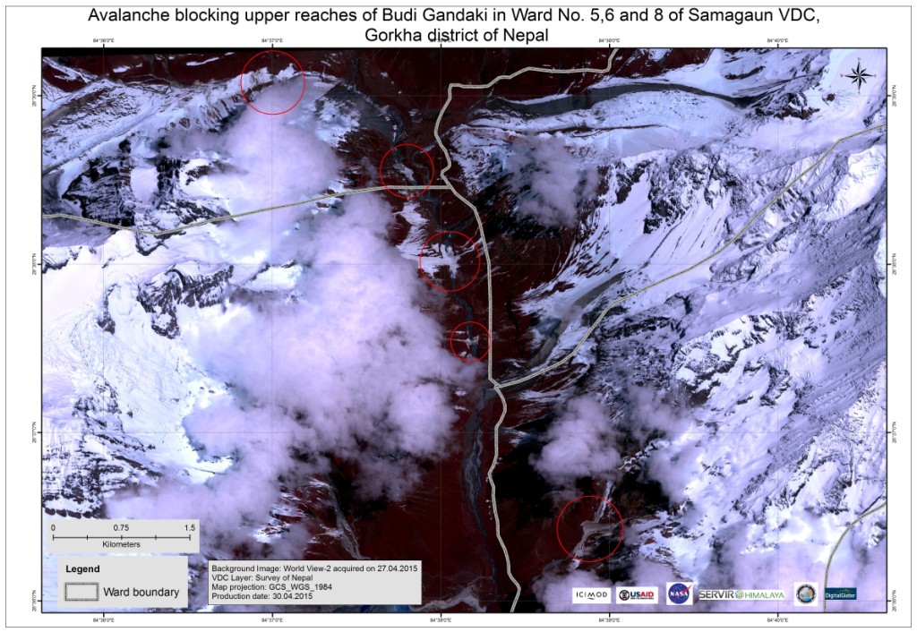 Other landslides These are just some landslides on which information is available. There are possibilities of many more now and more likely in coming monsoon months. ICIMOD[24] has provides some indications & maps of river blocking landslides like: Site of potential landslide blocking a stream in Ward No. 5, Samagaun VDC, Gorkha district of Nepal, Avalanche blocking upper reaches of Budi Gandaki in Ward No. 5 and 8 of Samagaun VDC, Gorkha district, among others. Indian Express reported[25] that on April 28 afternoon, six persons were killed and 10 injured when a landslide buried a bus between Mungling and Narayanghat.