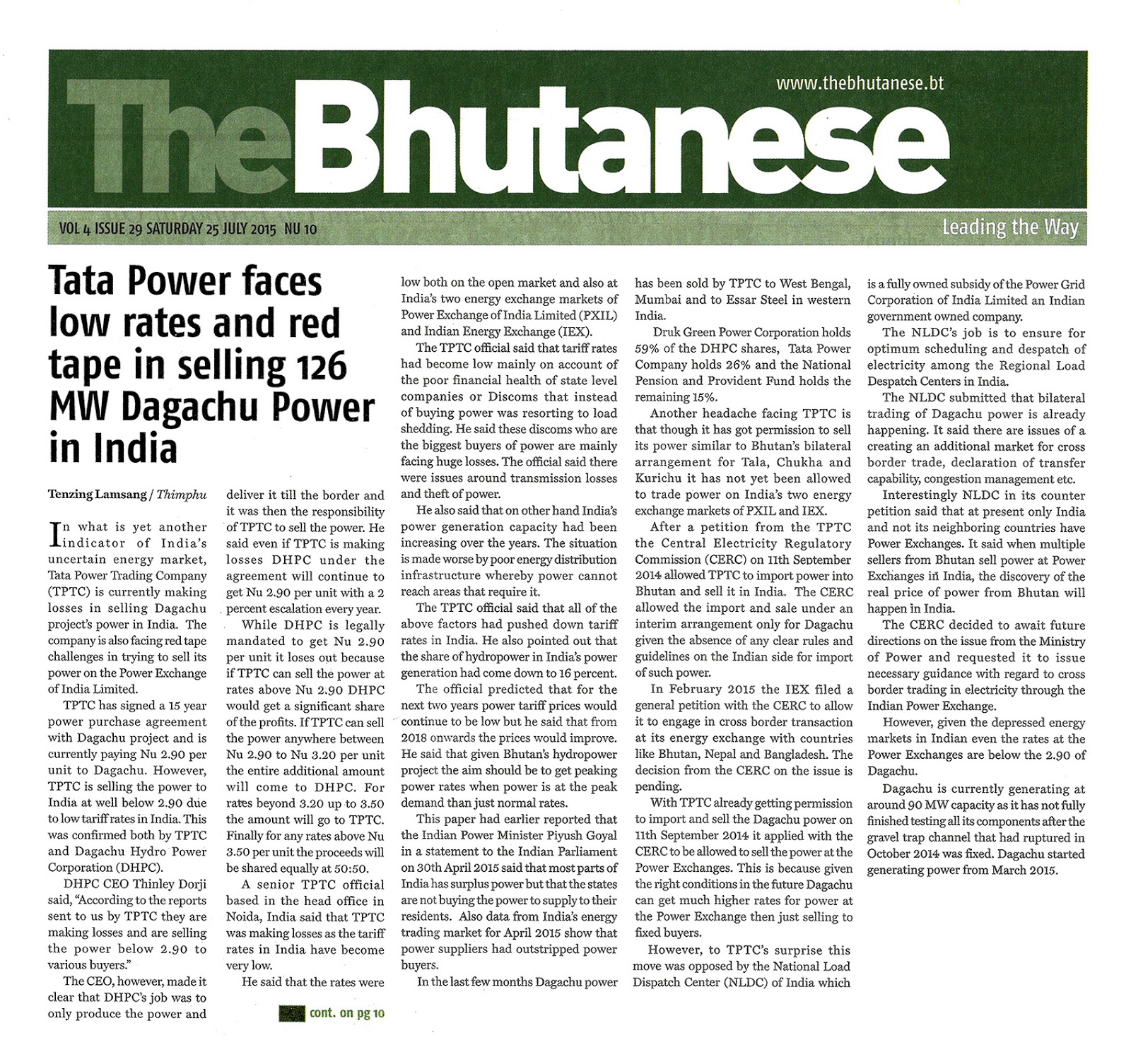 Bhutan’s hydropower expansion is hinged on the assumption that it will profit from India purchasing a large fraction of the generated power. The massive investments will be fruitless if India does not buy the power. However in July 2015, it was reported that Tata Power is making losses in selling power from Dagachu‘s project in India. While DGPC gets the fixed price per unit under the power purchase agreement between the 2 companies, it loses out as it is also entitled to a significant share of the profits that Tata Power may make.