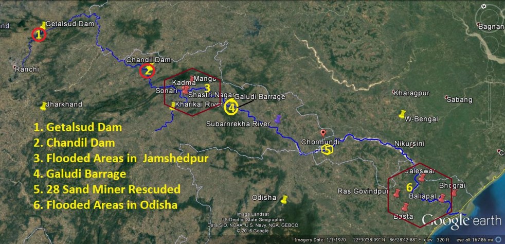 Following heavy rainfall, on August 17, 2016, Chandil dam, Jharkhand released huge amount of water in Subarnrekha River. As a result there was sudden surge of waters in Subarnrekah River causing worrisome situation in Jamshedpur town and in areas further downstream along the river in West Bengal and Odisha States.