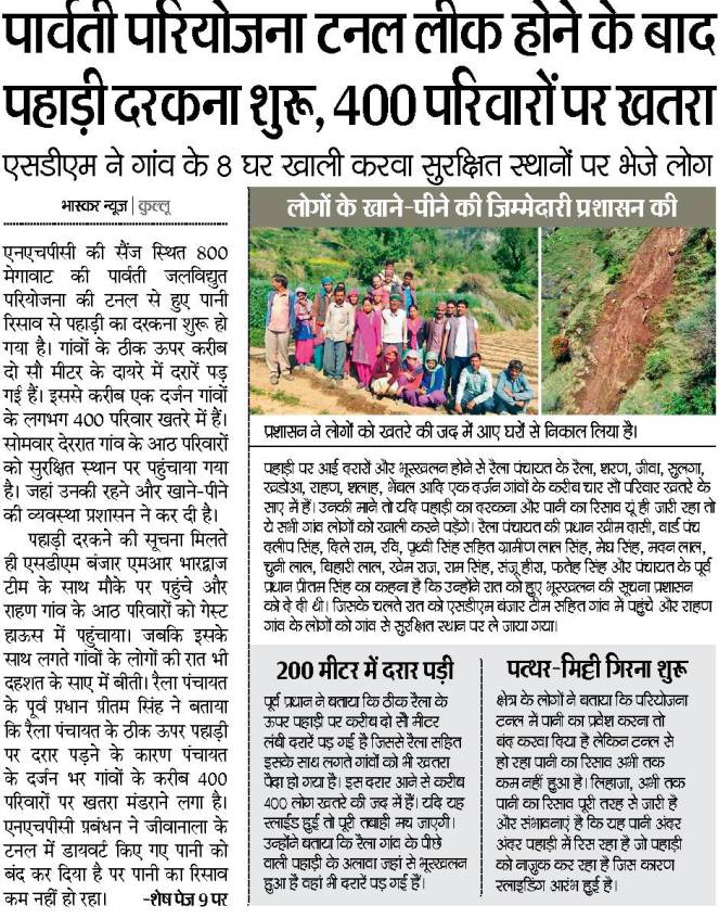 [i] Dainik Bhaskar, April 15, 2017, April 19, 2017, http://timesofindia.indiatimes.com/city/shimla/leakage-in-nhpcs-tunnel-wreaks-havoc/articleshow/58200954.cms, http://www.tribuneindia.com/news/himachal/water-leakage-from-parbati-tunnel-worries-villagers/392034.html, Dainik Jagran, Amar Ujala, Divya Himachal of April 19, 2017