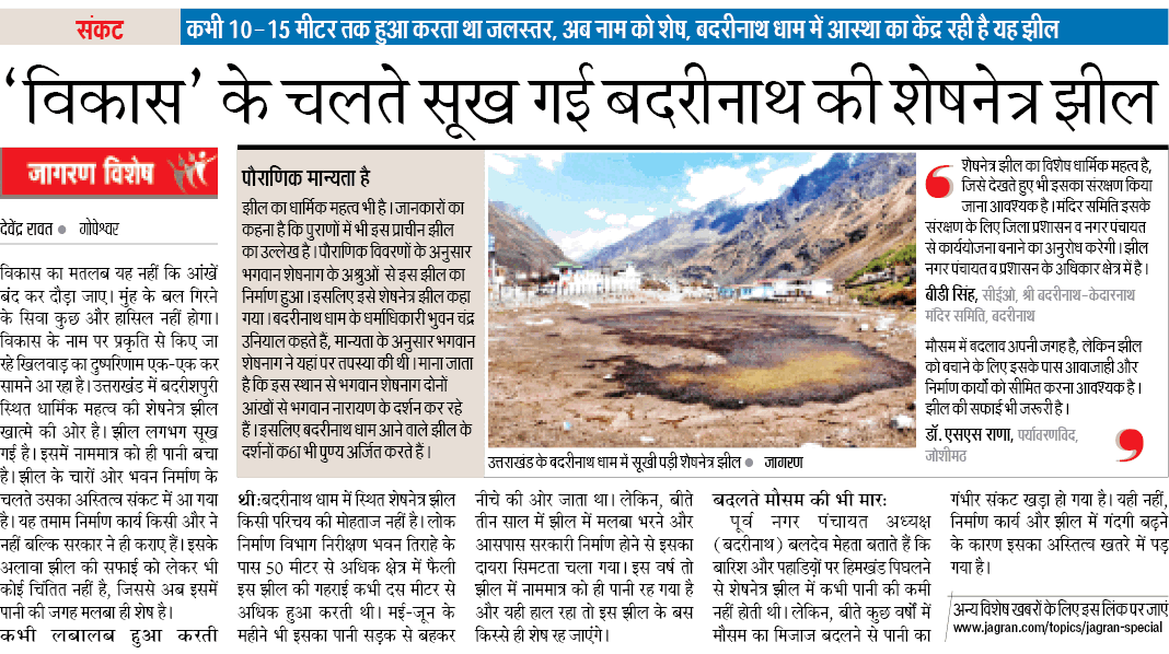 सूख गई बदरीनाथ की शेषनेत्र झील (Dainik Jagran, 04 May 2018) विकास के नाम पर प्रकृति से किए जा रहे खिलवाड़ का दुष्परिणाम एक-एक कर सामने आ रहा है। उत्तराखंड में बदरीशपुरी स्थित धार्मिक महत्व की शेषनेत्र झील खात्मे की ओर है। झील लगभग सूख गई है। इसमें नाममात्र को ही पानी बचा है। झील के चारों ओर भवन निर्माण के चलते उसका अस्तित्व में आ गया है। यह तमाम निर्माण कार्य किसी और ने नहीं बल्कि सरकार ने ही कराए हैं। इसके अलावा झील की सफाई को लेकर भी कोई चिंतित नहीं है, जिससे अब इसमें पानी की जगह मलबा ही शेष है।