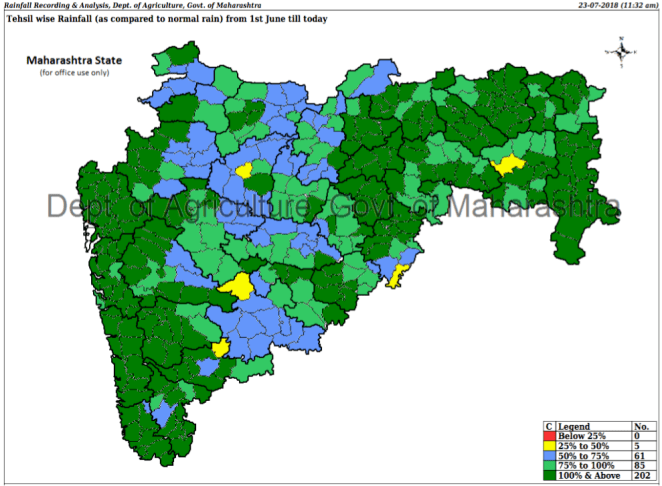 Flood prospects? Such high rainfall situation could lead to flood situation. In that context, it would be useful to monitor the Reservoir situation[vi] in Maharashtra. As per Maharashtra Water Resources Department’s Daily Reservoir Bulletin (again more informative than such data from any other state) for July 23, 2018, Maharashtra’s major reservoirs are 51.86% full. Konkan’s major reservoirs are 85.84% full, while the situation in Marathwada is much worse with only 19.3% live storage capacity filled, medium reservoirs are 39.89% full and minor reservoirs 29.7%, the state wide total storage filled is 48.83%.