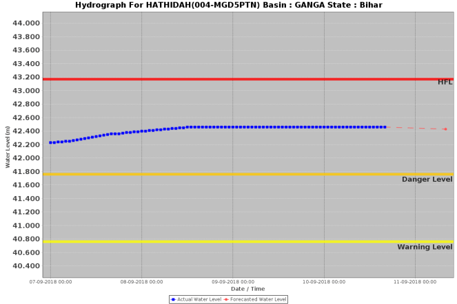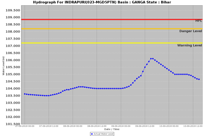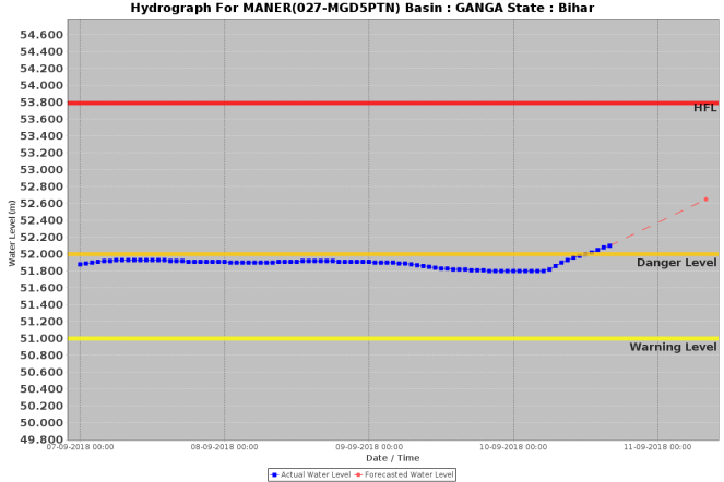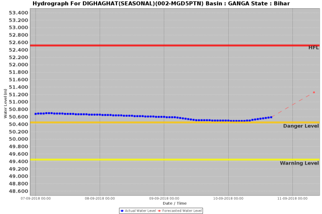 Post Sone-Ganga confluence downstream of Maner, Dighighat is the first flood forecasting site of CWC, on Ganga river. Water level here, already above danger level for several weeks now, was at 50.59 m at 1600 hours on Sept 10, with CWC forecasting it to rise steeply to reach 51.26 m by 0800 am on Sept 11, 2018. The HFL here is 1.26 m from that level at 52.52 m.