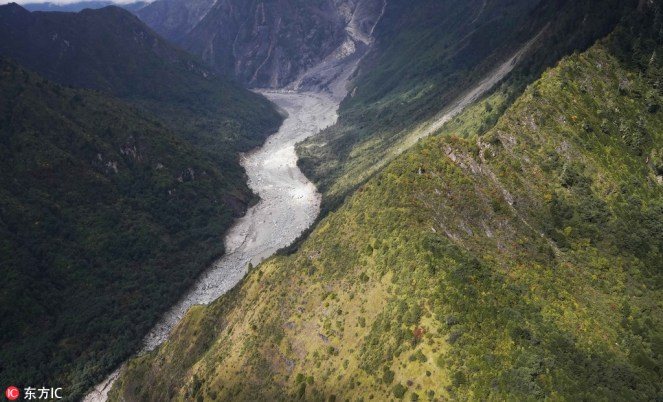 Dry riverbed downstream from the barrier lake formed by a landslide in the Yarlung Zangbo River in Southwest China’s Tibet autonomous region on Oct 17.