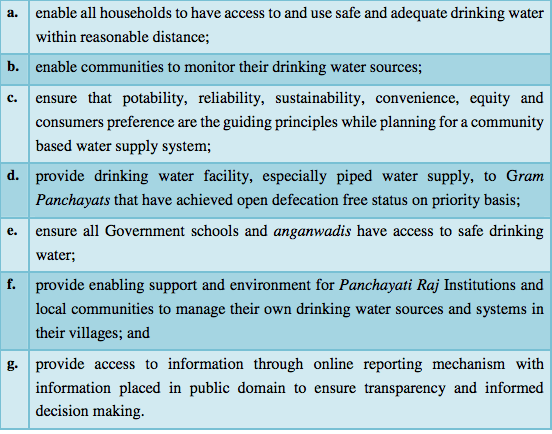 | All rural habitations, Government schools and anganwadis to have access to safe drinking water | Coverage of rural habitations increased by 8 % at 40 lpcd and 5.5 % on the basis of 55 lpcd during 2012-17 despite the expenditure of Rs 81,168 crore. Only 44 % of rural habitations and 85 % of govt schools and anganwadis provided access to safe drinking water. |