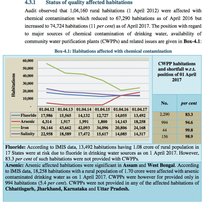 - Another screenshot photo shows the break up of contamination affected villages and how low is the coverage of Community Water Purification Plants: 16.7% for Fluoride affected habitations, 5.4% for Arsenic affected, 0.2% for Iron Affected and 1.1% for salinity affected.