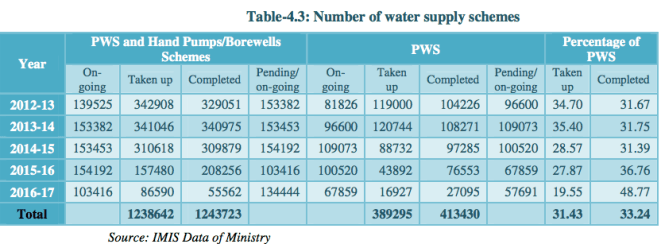 - CAG says: “There was inadequate focus on surface water based schemes and a large number of schemes (98 per cent) including piped water schemes continued to be based on ground water resources.” See figure, but does not explain why should there be more focus on surface water schemes.