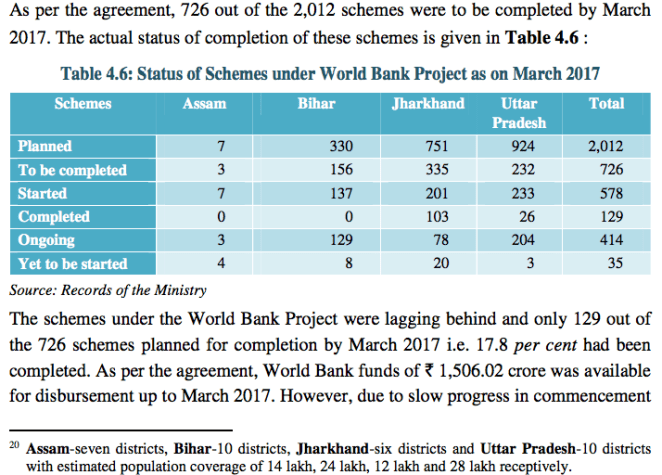 - WORLD BANK FUNDED SCHEME IN FOUR STATES: A project for rural water supply in four low income States viz. Assam, Bihar, Jharkhand and Uttar Pradesh was started by the Ministry in December 2013 in collaboration with the World Bank. Under the project, a rural population of 78 lakh in 33 districts of four States was to be covered with 2,012 piped water supply schemes by 2020 at an estimated cost of Rs 6,147 crore (equivalent to USD 1 billion21), USD 500 million was to come from the WB and the rest from Centre, states and beneficiaries. The scheme is lagging behind, see the details in screenshot from CAG report.
