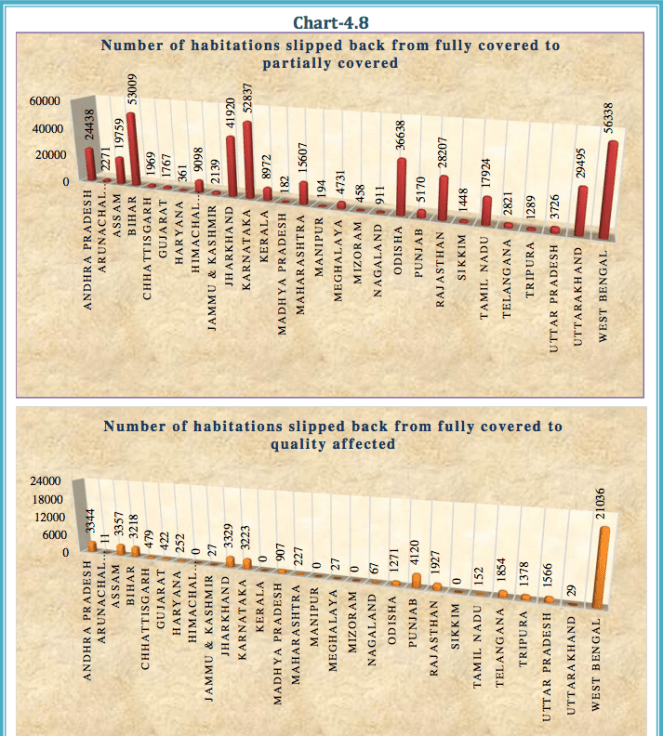 - SLIP-BACK PERSISTS: C&AG’s Performance Audit Report (No.12 of 2008) on the Accelerated Rural Water Supply Programme had highlighted the problem of slip-back of habitations from fully covered to partially covered or quality affected. However, 4.76 lakh habitations had slipped back during the period 2012-2017, as can be seen from following state wise break up.