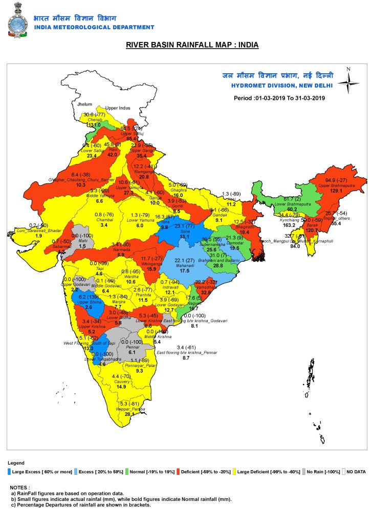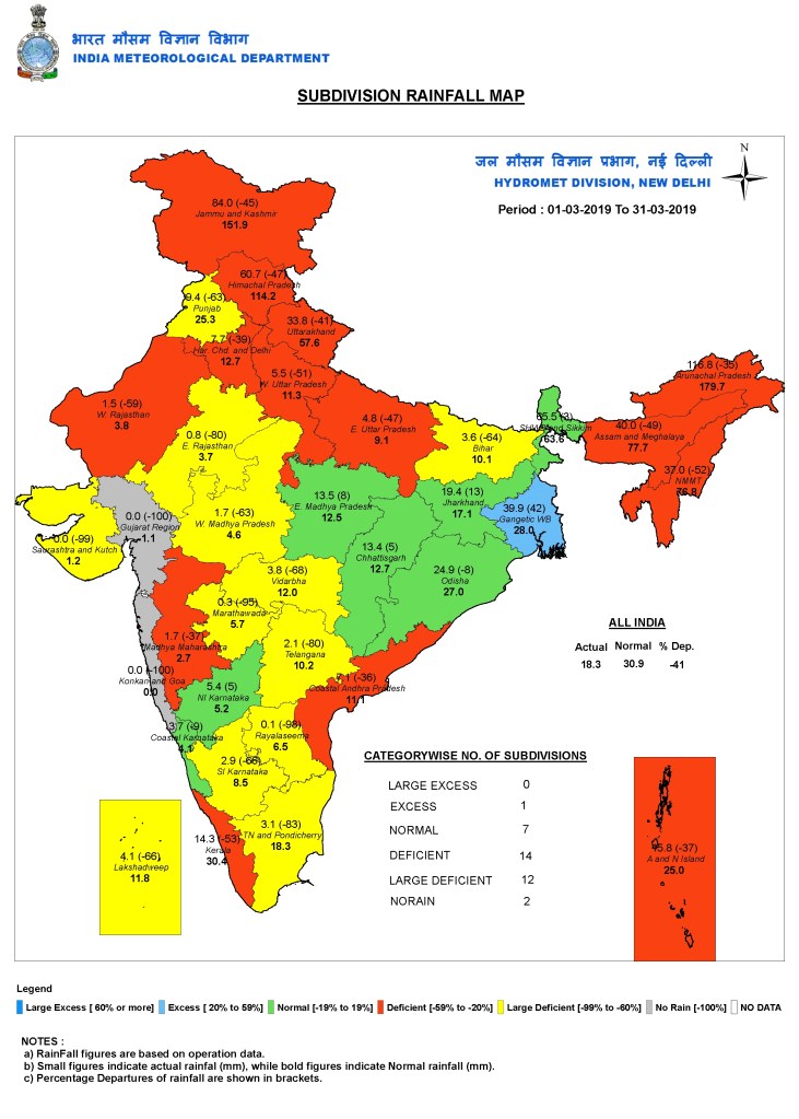 The following maps from IMD shows the rainfall in India during March 2019: Sub division wise, state wise and river basin wise. Normal rainfall during the month at all India level is supposed to be 30.9 mm, but actual rainfall was 41% below normal, at 18.3 mm.