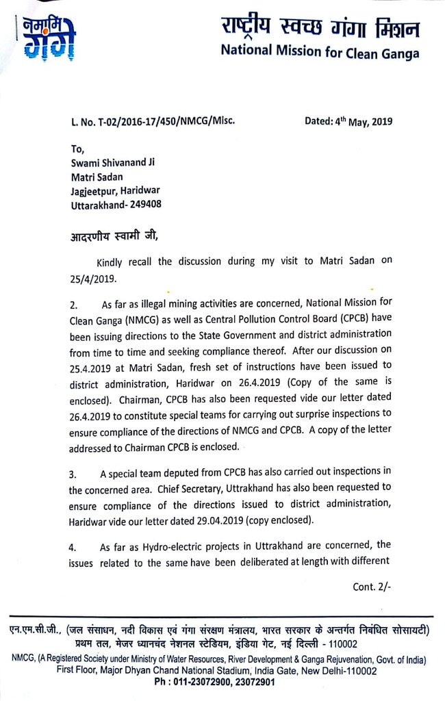 युवा संत आत्मबोधानंद जी ने आज अपने 194 दिन के लंबे अनशन को विराम दिया। गंगा की अविरलता निर्मलता के लिए मातृ सदन के युवा सन्यासी का संकल्प एक मुकाम पर पहुँचा। आज 4 मई 2019 को राष्ट्रीय स्वच्छ गंगा मिशन की डायरेक्टर जनरल श्री राजीव रंजन मिश्रा जी का पत्र मातृ सदन में प्राप्त हुआ । स्वामी शिवानंद जी को लिखे पत्र की पहली पंक्ति है — Kindly recall the discussion during my visit to Matri Sadan on 26/4/2019.