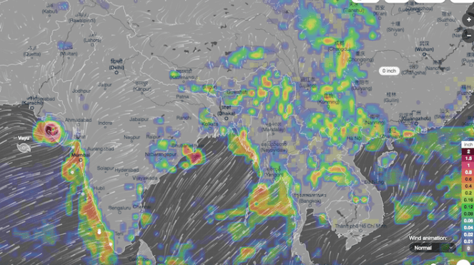 Accuweather, another website (https://www.accuweather.com/en/weather-news/powerful-cyclone-vayu-to-pass-dangerously-close-to-gujarat-india/70008502) said: “Downpours can drop 25-75 mm (1-3 inches) across western Saurashtra through Friday, threatening to cause flash flooding in some communities. A Local Storm of 200 mm (8 inches) cannot be ruled out in the most persistent downpours.”