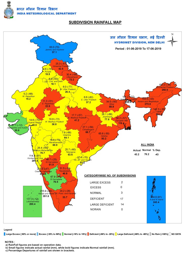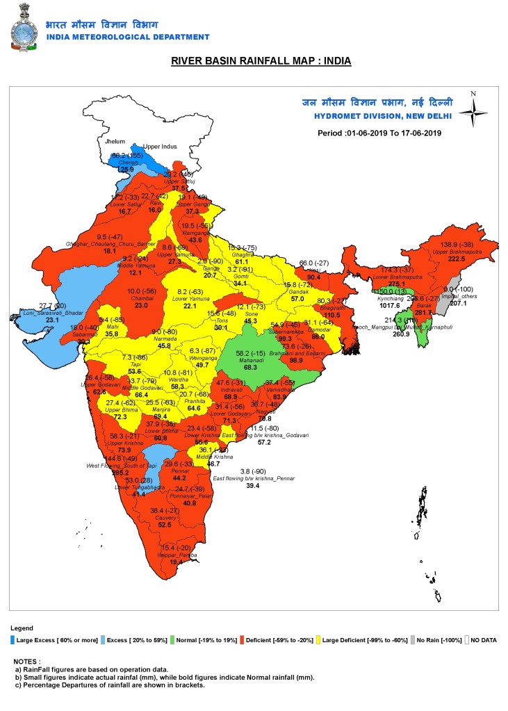 According to the Central Water Commission, the water level in reservoirs of south Indian states and Maharashtra is lesser than the average of last ten years. Several parts of the country are reeling under intense heatwave, especially the east Indian states of Jharkhand, Bihar and Odisha. https://www.thehindu.com/news/national/rainfall-deficiency-hits-43-monsoon-progress-likely-in-the-next-2-3-days-imd/article27955688.ece (16 June 2019)