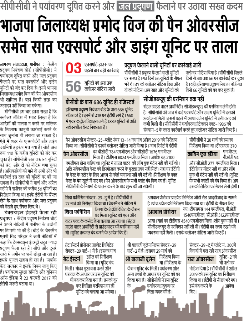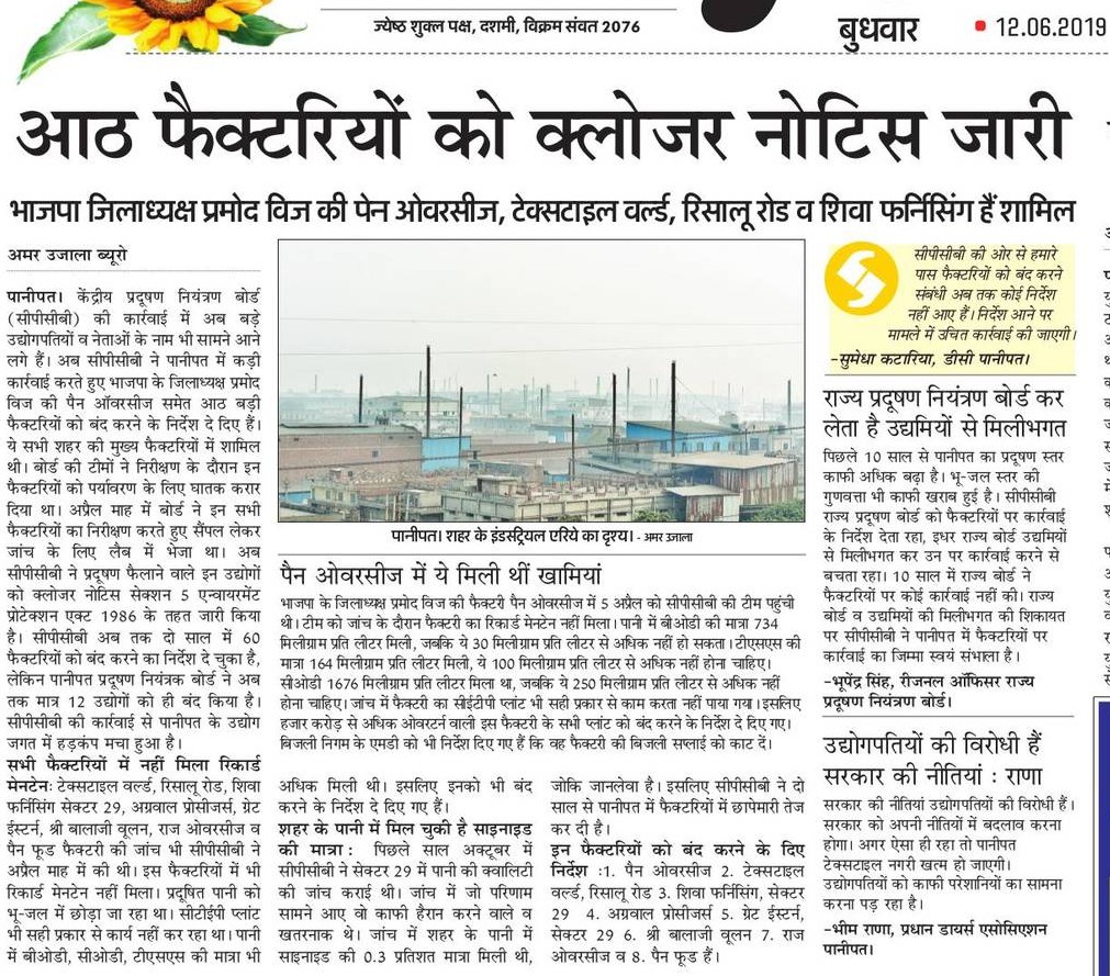 Haryana 5 industrial units get notice for water pollution The CPCB has issued notice to five industrial units in Bari and Sonepat industrial areas. The units’ owners have been told to take immediate steps to stop the release of chemically polluted water from the units. The owners have been cautioned that if the necessary steps are not taken, the supply of electricity and water could be stopped. This action has been taken following some deficiencies in the samples of the released water during testing in the laboratory. There were complaints about the release of chemically polluted water in the open area as well as in the sub-soil water by the units located in these industrial areas. https://www.tribuneindia.com/news/haryana/5-industrial-units-get-notice-for-water-pollution/788413.html (16 June 2019)