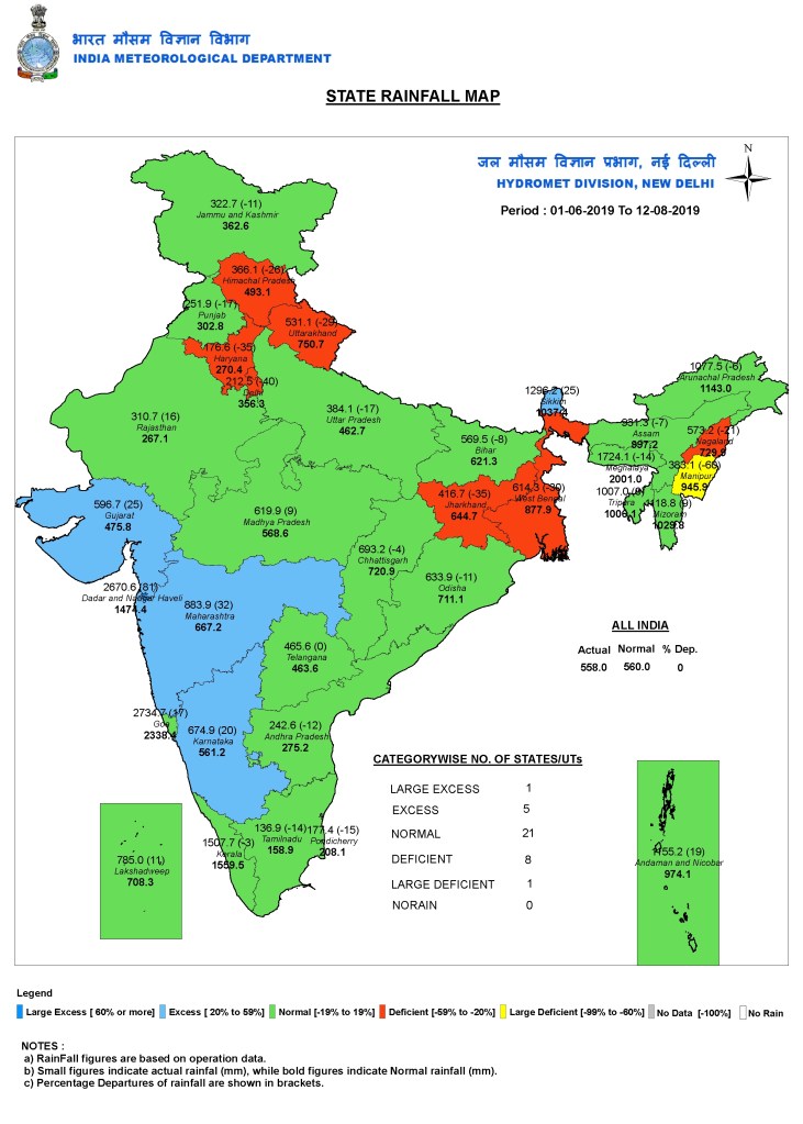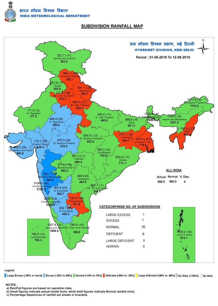 Data from the IMD is revealing. If one were to look at Kerala’s rainfall this monsoon season beginning June 1 until August 7, the state has recorded a deficit of 27%, with 1078.6 mm rainfall against the normal of 1482.4 mm. But between August 1 and August 7, the state saw 22% excess rainfall. Seven districts have recorded excess rainfall over this week, with Palakkad recording a massive 80% departure from the normal. Malappuram, Kozhikode, Thrissur and Wayanad have also witnessed a sharp departure from the normal rainfall, with excess at 66%, 53%, 40% and 37% respectively. https://www.thenewsminute.com/article/explainer-how-changes-global-weather-conditions-have-led-extreme-rain-kerala-107006 (10 Aug. 2019)