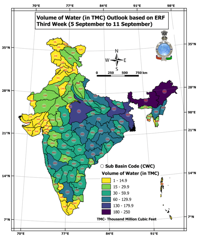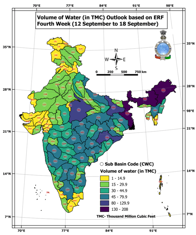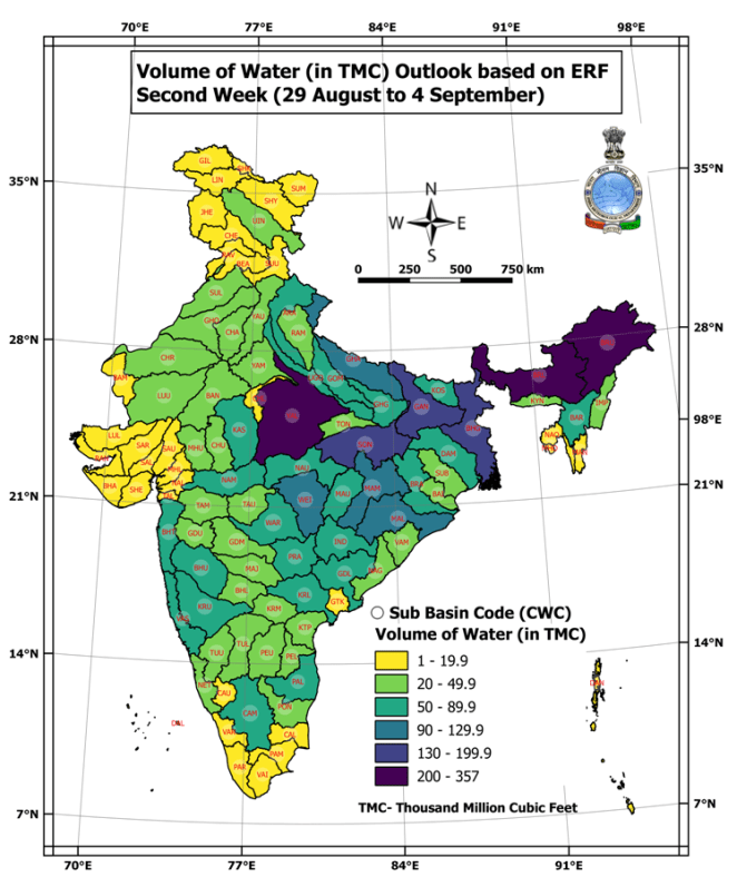 • Map showing “Expected volume of water” (in TMC or Thousand Million Cubic Ft) forecast range in each sub basin in color code for week 1 (Aug 22-28 when checked on above dates), week 2 (Aug 29-Sep 4), week 3 (Sep 5-11) and week 4 (Sep 12-18), and also cumulative expected volume of water for week 1 &2, week 1-3 and week 1-4.
