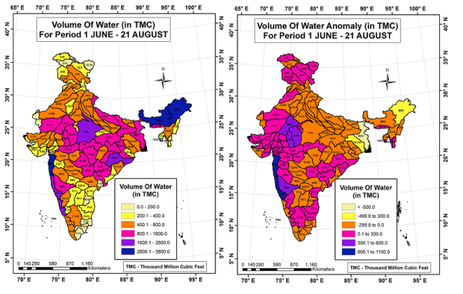 • Maps showing with color codes for different ranges, the volume of water (and Rainfall through a separate set of maps) that fell in different sub basins from June 1 to Aug 21 (when checked on Aug 26/27, 2019) and anomaly with respect to normal figure.