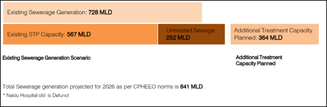 The DMP of the PRDP gives following figures for sewage generation and treatment. These figures have been borrowed from the JICA Report[13] which states that Pune generates about 728 MLD of sewage and treats about 567 MLD (assuming that the STPs function at their full capacity).