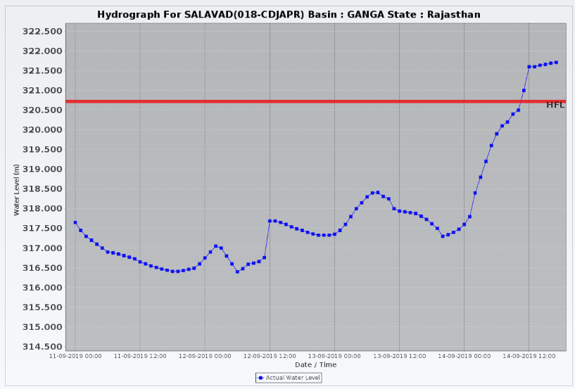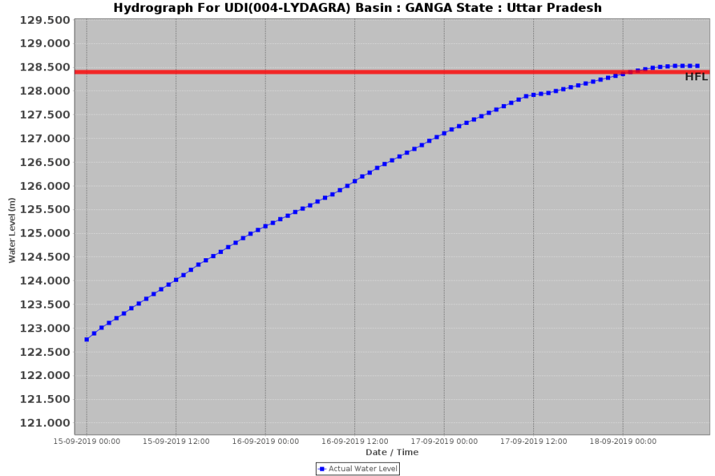 Chambal River has crossed HFL (128.4 m dated 24.8.1996) at Udi, Etawah, Uttar Pradesh. Flowing at 128.53 m with steady trend.