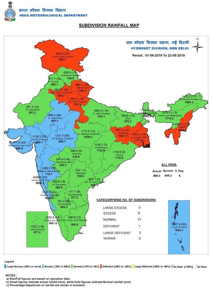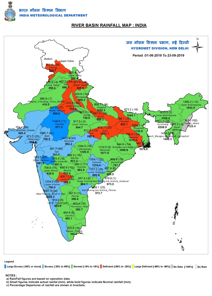 The rainfall has been excess in West Madhya Pradesh to the tune of 54%. Both Uttar Pradesh and Bihar have witnessed deficient rains to the tune of at least 20% each, despite an excess of 4% monsoon rains over the country this season. The deficit has been much more pronounced in neighbouring Jharkhand, where some districts are facing drought-like conditions. https://www.livemint.com/news/india/flood-alert-for-up-bihar-as-river-waters-rise-over-next-few-days-1568712972286.html (17 Sept. 2019)