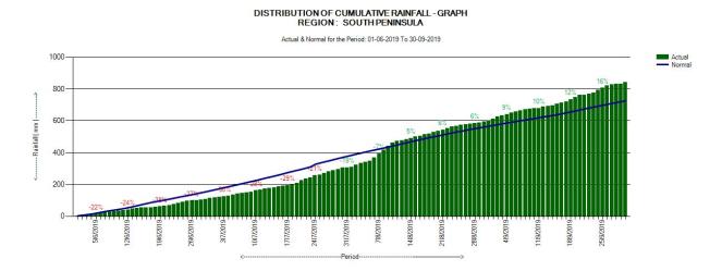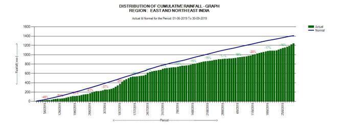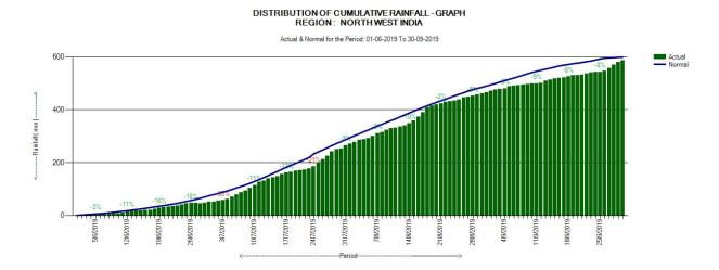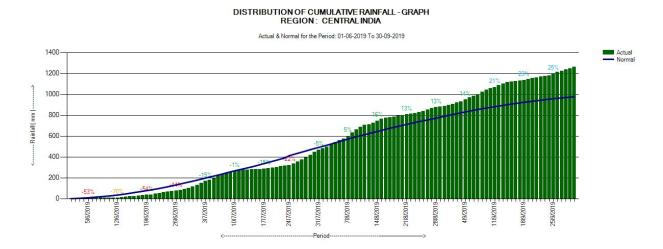 CUMULATIVE RAINFALL BAR CHART – All India The bar chart below, also from IMD, provides the daily cumulative All India rainfall throughout the SW monsoon from June 1 to Sept 30, 2019, along with the normal cumulative rainfall for the respective dates. As we can see, the cumulative rainfall was below normal till around Aug 9, 2019, and starts becoming normal and above normal thereafter.