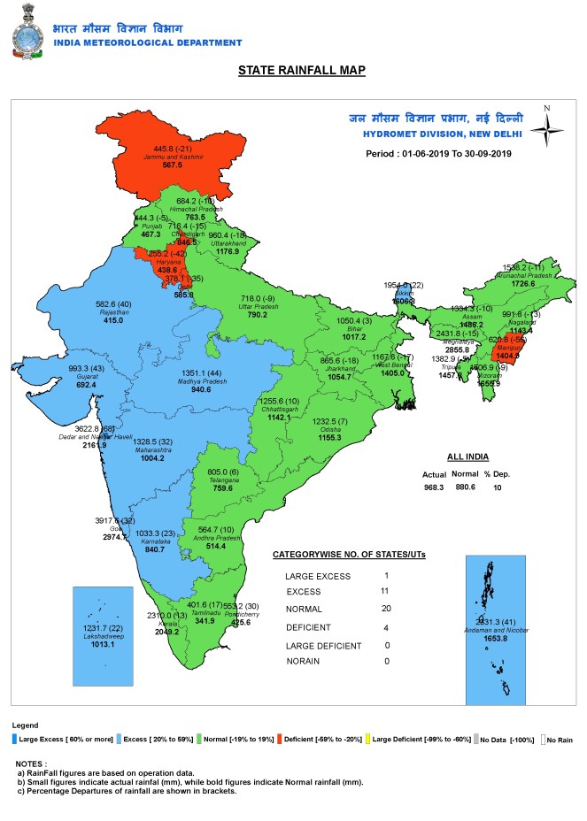 State wise rainfall As we can see from map below, out of 36 states and Union Territories (UT) of India, one (Dadar and Nagar Haveli got 68% above LPA)) received Large Excess (more than 59% above LPA) rainfall, 11 received Excess (20-59% above LPA) rainfall, 20 received normal (Between 19% above to 19% below LPA) rainfall and four received deficit (20-59% below LPA) rainfall. The four deficit rainfall states were: Manipur (56% below normal), Haryana (42%), Delhi (35%) and Jammu & Kashmir (21%).