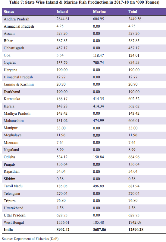 Inland fisheries “The inland resources are in the form of rivers and canals (1.95 lakh km), floodplain lakes (8.12 lakh hectares), ponds and tanks (24.1 lakh hectares), reservoirs (31.5 lakh hectares), brackish water (12.4 lakh hectares), saline/ alkaline affected areas (12 lakh hectares) etc… The total fish production in the country stood at 13.42 million metric tonnes (provisional) during 2018-19. Of this, the marine fisheries contributed 3.71 million metric tonnes and the inland fisheries contributed 9.71 million metric tonnes. During 2018-19, 71 per cent of marine fisheries potential and 58 per cent of the inland fisheries potential have been harnessed… To address the gaps in fisheries infrastructure, the government has created the Fisheries and Aquaculture Infrastructure Development Fund (FIDF) during 2018-19 with a total fund size of Rs 7,522.48 crore.” (Para 7.28-30) It’s good to see this mention about inland fisheries, it provides employment to millions, but there is nothing much that the Economy does for them.