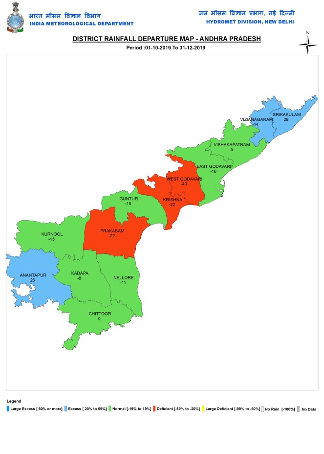 During post monsoon 2019, AP got 269 mm rains, 7% below normal. In this period Rayalseema received 225.4 mm or 1% above normal rains.