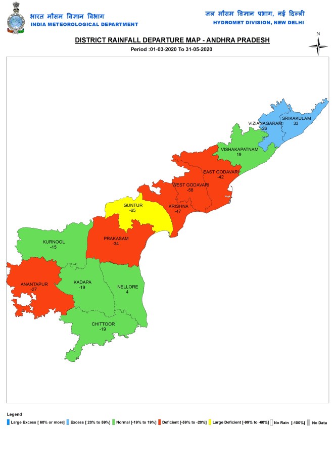 Andhra Pradesh During pre monsoon 2020 months, AP received 75.2 mm or 18% below normal rainfall. Rayalseema got 65.3 mm or 20% below normal rain.