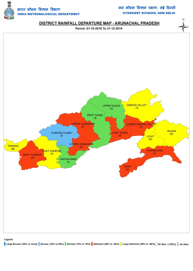 During post monsoon 2019 months, Arunachal got 145.4 mm or 46% below normal rain. East Kameng again had the lowest rainfall at 62.8 mm, while Papum-Pare district had the highest rainfall at 272.7 mm.
