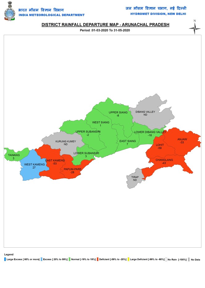 Arunachal Pradesh During pre monsoon 2020 season Arunachal Pradesh got 599 mm, 22% below normal rains. IMD had no data for three districts. Besides them, East Kameng had the lowest rainfall at 230.7 mm, and Lower Dibang Valley district had the highest rainfall at 997.5 mm.