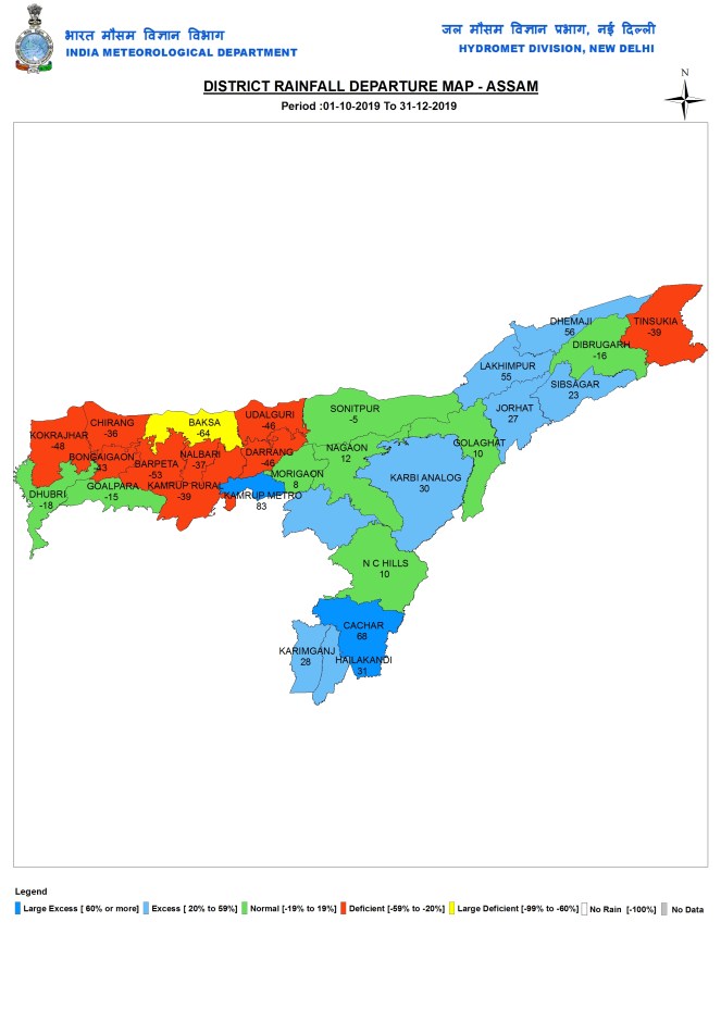 During post monsoon 2019 season, Assam had 161.1 mm rains, close to normal rainfall of 161.5 mm. It ranged from 51.7 mm in Baksa to 398.4 mm in Cachar district.
