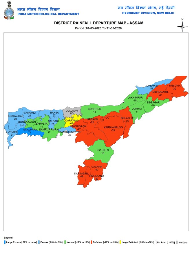 Assam During pre monsoon 2020 season, Assam received 489.9 mm or 10% below normal rain. IMD had no data for Udalguri district. Besides that, rainfall ranged from low of 172.8 mm in Darrang district to 1117.5 mm in Goalpara district.