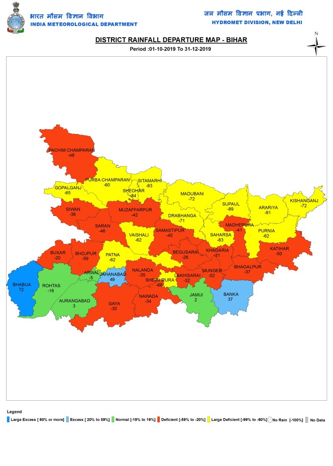 During post monsoon 2019 season, Bihar received 42.2 mm, 42% below normal rains, ranging from 7.7 mm in Arariya to 121.4 mm in Banka.