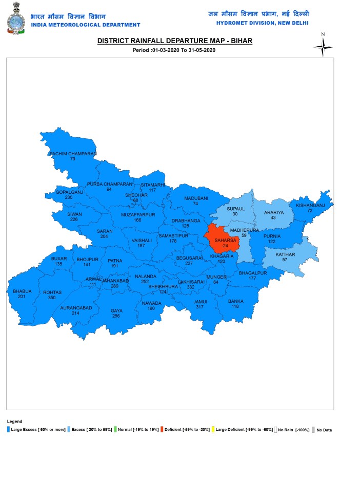 Bihar During pre monsoon 2020 months, Bihar had 182.5 mm, 123% above normal rains. Range was from 55.6 mm in Arwal district to 417.2 mm in Purnia.