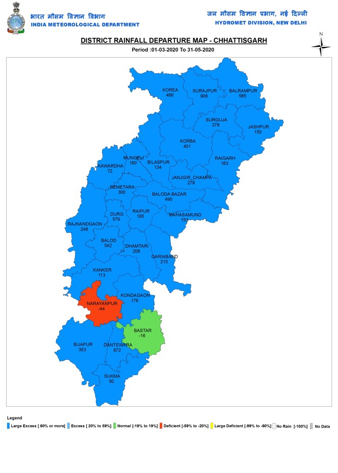 EAST INDIA Chhattisgarh During pre monsoon 2020 months, Chhattisgarh in East India received 119.5 mm or 192% above normal rains. It ranged from 26.5 mm in Naryanpur district to 245.4 mm in Surajpur district.