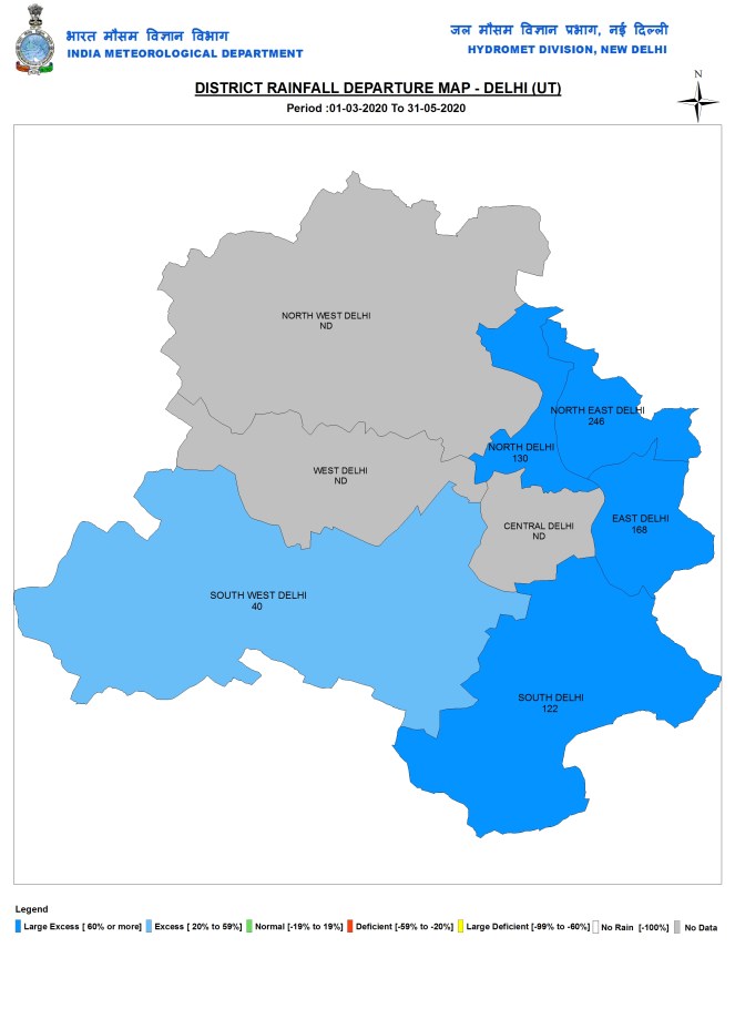 Delhi During pre monsoon 2020 season, Delhi had 102.1 mm rains, double the normal rain. Strangely for three of the nine districts, IMD had no data: Central Delhi, NW Delhi and W Delhi. 2 districts had excess and four had LE rainfall. During post monsoon 2019 season, National capital received 41.6 mm rains, 83% above normal. One district had deficit, one had normal two had excess and five had LE rains.