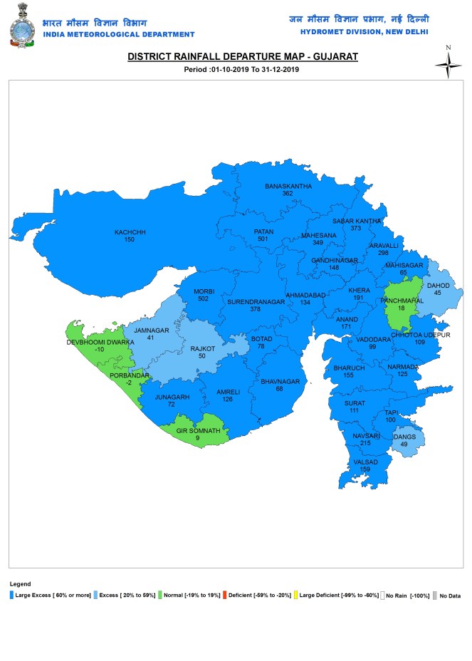During post monsoon 2019 season, Gujarat received 72.8 mm rain, which is 156% above normal. Saurashtra and Kutch received 63.9 mm or 132% above normal rainfall.