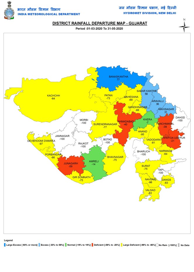 Gujarat During pre monsoon 2020 season, Gujarat received just 2.6 mm rain, 49% below normal. Saurashtra & Kutch received just 1.1 mm rainfall, 73% below normal.
