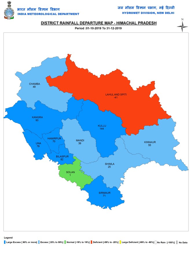 During post 2019 monsoon season, HP had 33% surplus rainfall at 121.4 mm. Lahul Spiti had deficit, Solan had normal rainfall. 4 districts had Excess and six had large excess rainfall.