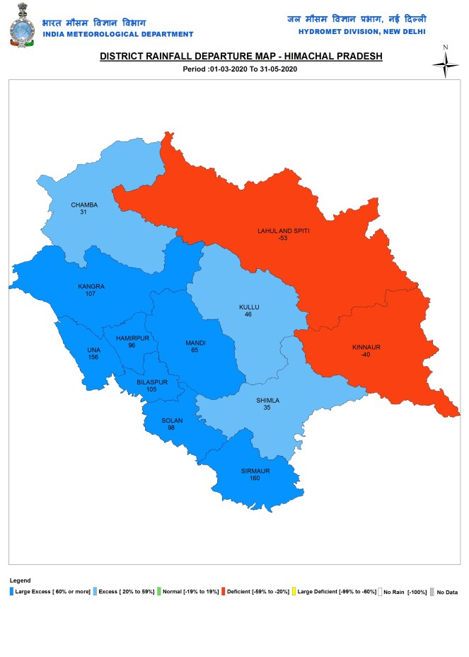 Himachal Pradesh In pre monsoon 2020 season, HP got 271.1 mm rainfall, 11% above normal. Out of 12 districts of HP, two tribal districts (Kinnaur and Lahul-Spiti) got deficit rainfall. Chmba, Kullu and Shimla got Excess rainfall and rest of the seven districts got Large Excess rainfall. Sirmaur had the highest surplus at 160%. Lahul Spiti had the highest deficit at 53%. Chamba had the highest rainfall at 415.9 mm and Kinnaur had the lowest rainfall at 154.2 mm.