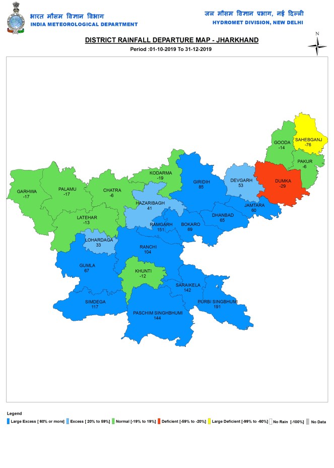 During the post monsoon 2019 months, it got 141.3 mm rains, 56% above normal. Rainfall range was from 32.2 mm in Sahibganj to 260 mm in E Singhbhum district.