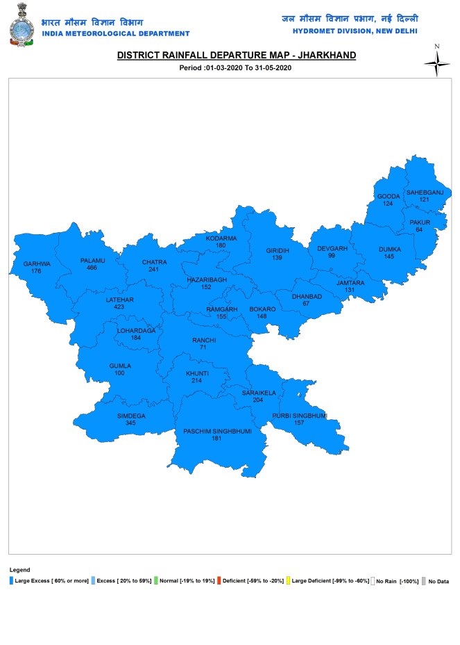 Jharkhand During pre monsoon 2020 season, Jharkhand received 218.6 mm rains, which was 162% above normal. The rainfall ranged from 79.8 mm in Garhwa district to 347.7 mm in Simdega district.