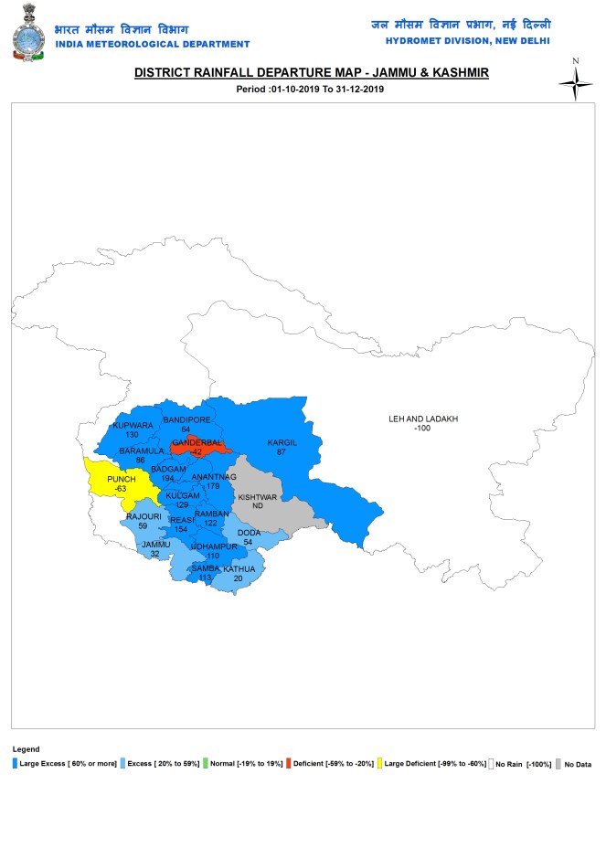 During Post 2019 monsoon, J&K had 253.3 mm rainfall, 88% above normal. IMD has not data of Ganderwal and Kistwar districts. In this season, Leh-Ladakh district had NO RAIN. Punch dist had large deficit at 63% with 38.5 mm rain. Doda, Jammu, Kathua and Rajouri districts had Excess rainfall and rest of the 14 districts had Large Excess rain. Badgam had the highest surplus at 194%. Ramban had the highest rainfall at 437.3 mm. Kargil with 26.8 mm had the lowest rainfall.