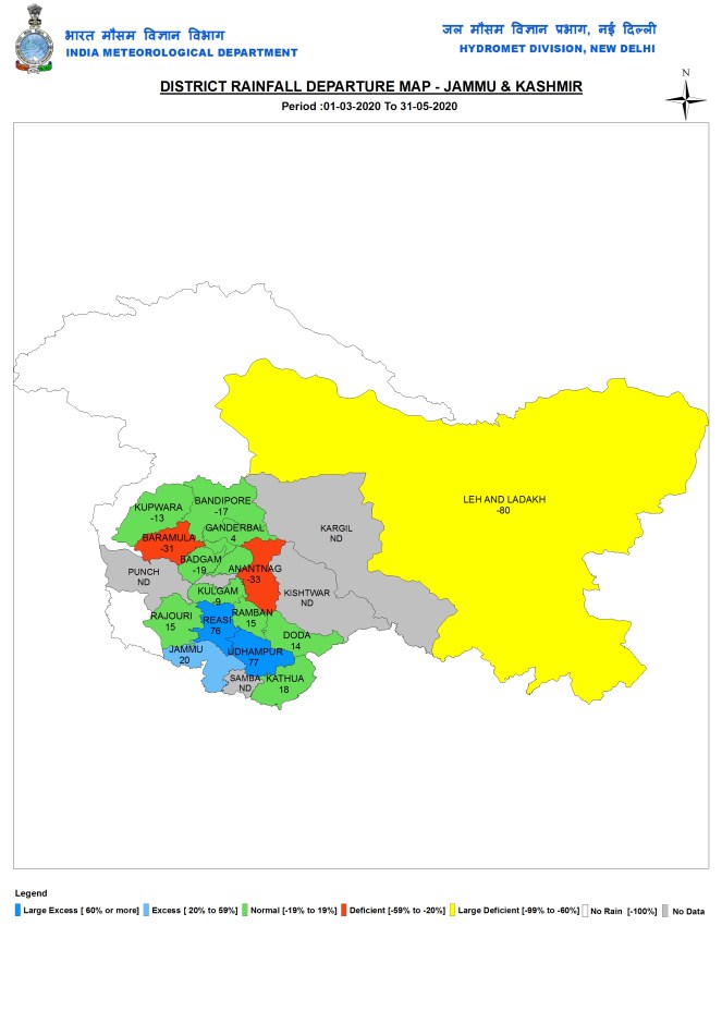 STATE WISE DISTRICT WISE RAINFALL: North Zone: Jammu and Kashmir During pre-monsoon 2020 season, the state had 330.2 mm rainfall, 2% below normal. For 5 of the 22 districts of J&K, IMD had NO DATA! These included Kargil, Kishtwar, Samba, Punch and Shopian. Anantnag and Baramulla had deficient rain, Jammu had Excess rain. Riasi and Udhampur districts had Large Excess rains. Leh-Ladakh with 5.6 mm rain, had Large Deficit at 80%. Rest of 11 districts had Normal rainfall. Ramban at 521.3 mm had the highest rainfall. Udhampur, Doda and Riasi also had rainfall above 400 mm.